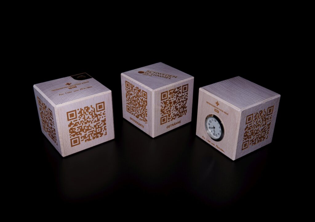 Your sustainable QR-Code wooden cube from local forests, refined with state-of-the-art laser technology, completely free of paint and chemicals.